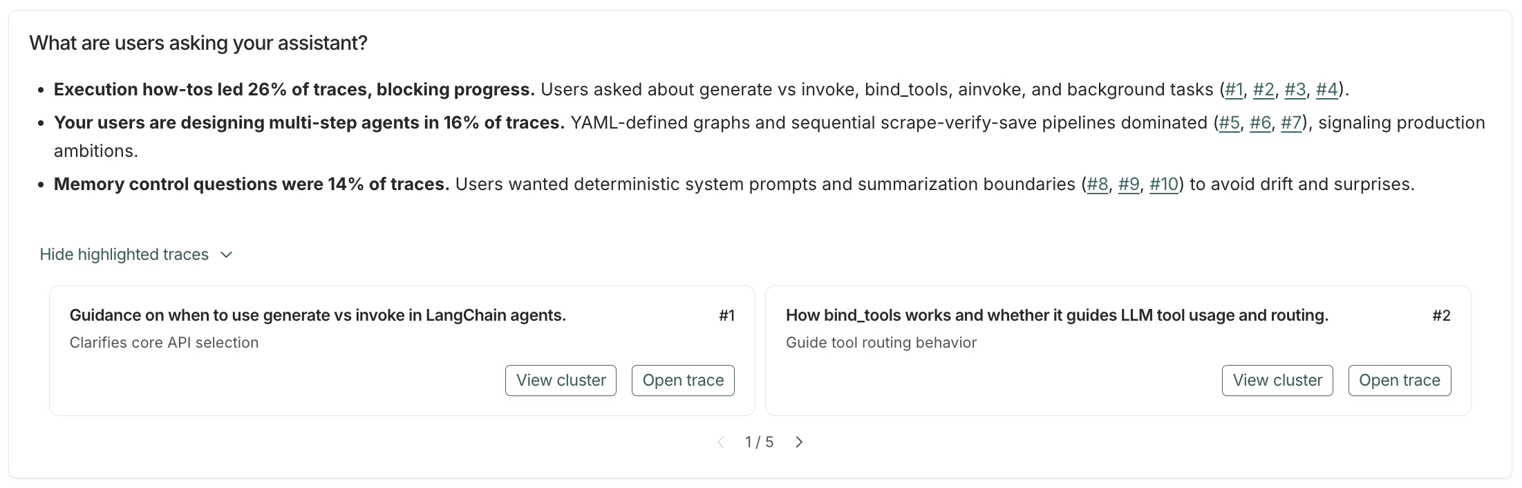 - Clickable references (e.g., #1, #2, #3) to traces the agent identified as exceptionally relevant to your question.